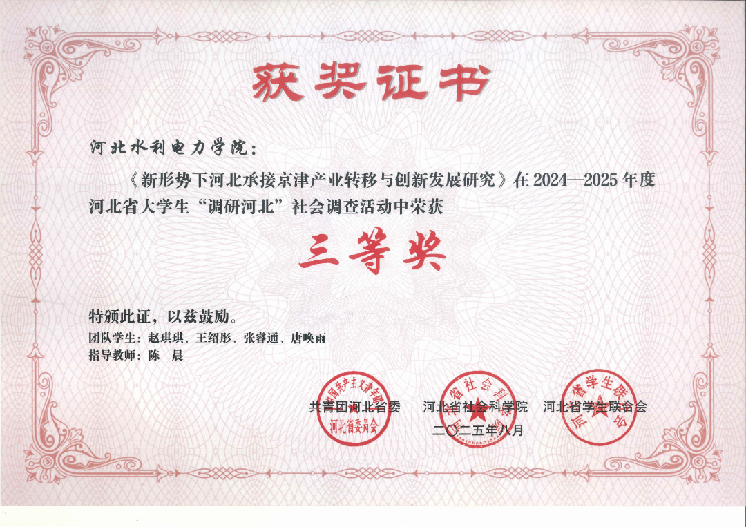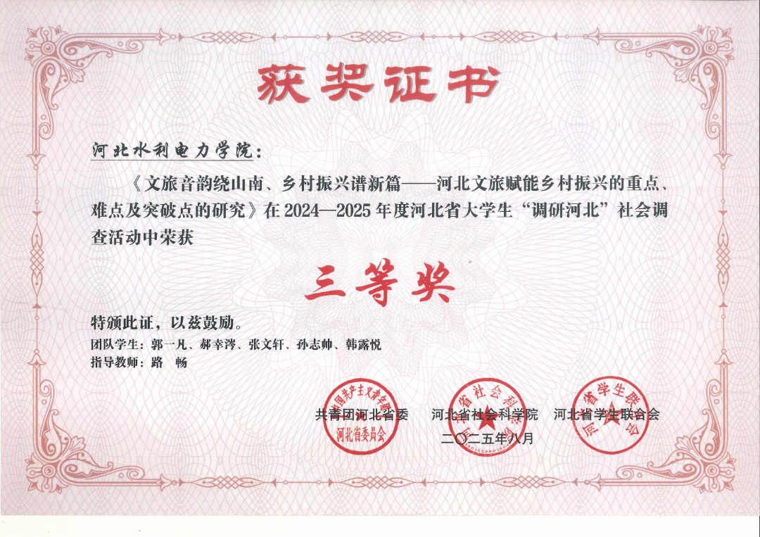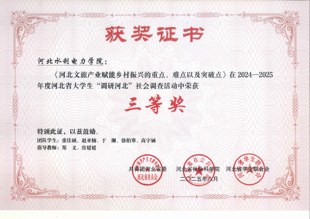 近日,共青团河北省委、河北省社会科学院以及河北省学生联合会公布了关于2024-2025年度河北省大学生“调研河北”社会调查活动的情况。在2024 - 2025年度河北省大学生“调研河北”社会调查活动中,同学们展现出了高度的社会责任感和使命感。我校同学积极参与调研活动,并在指导教师的帮助下荣获佳绩,其中《河北文旅产业赋能乡村振兴的重点、难点以及突破点》在活动中荣获三等奖,《文旅音韵绕山南、乡村振兴谱新篇——河北文旅赋能乡村振兴的重点》在活动中荣获三等奖,《新形势下河北承接京津产业转移与创新发展研究》在活动中荣获三等奖。