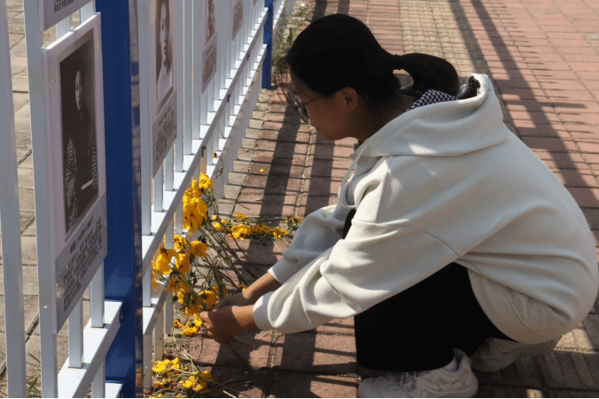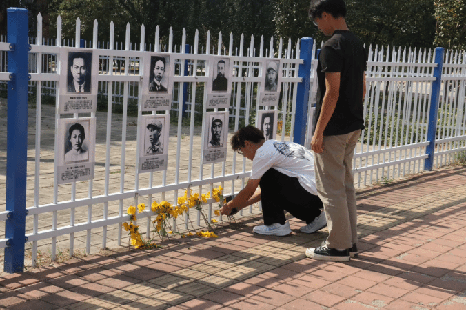 活动现场陈列了部分抗日战争时期的革命烈士照片,同学们纷纷驻足,向烈士们默哀、献花,传递对英烈的追思与敬意。