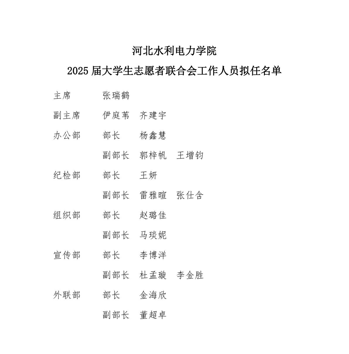 河北水利电力学院2025届大学生志愿者联合会工作人员拟任名单