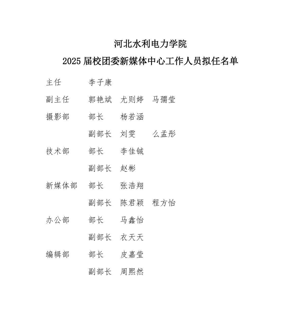 河北水利电力学院2025届校团委新媒体中心工作人员拟任名单