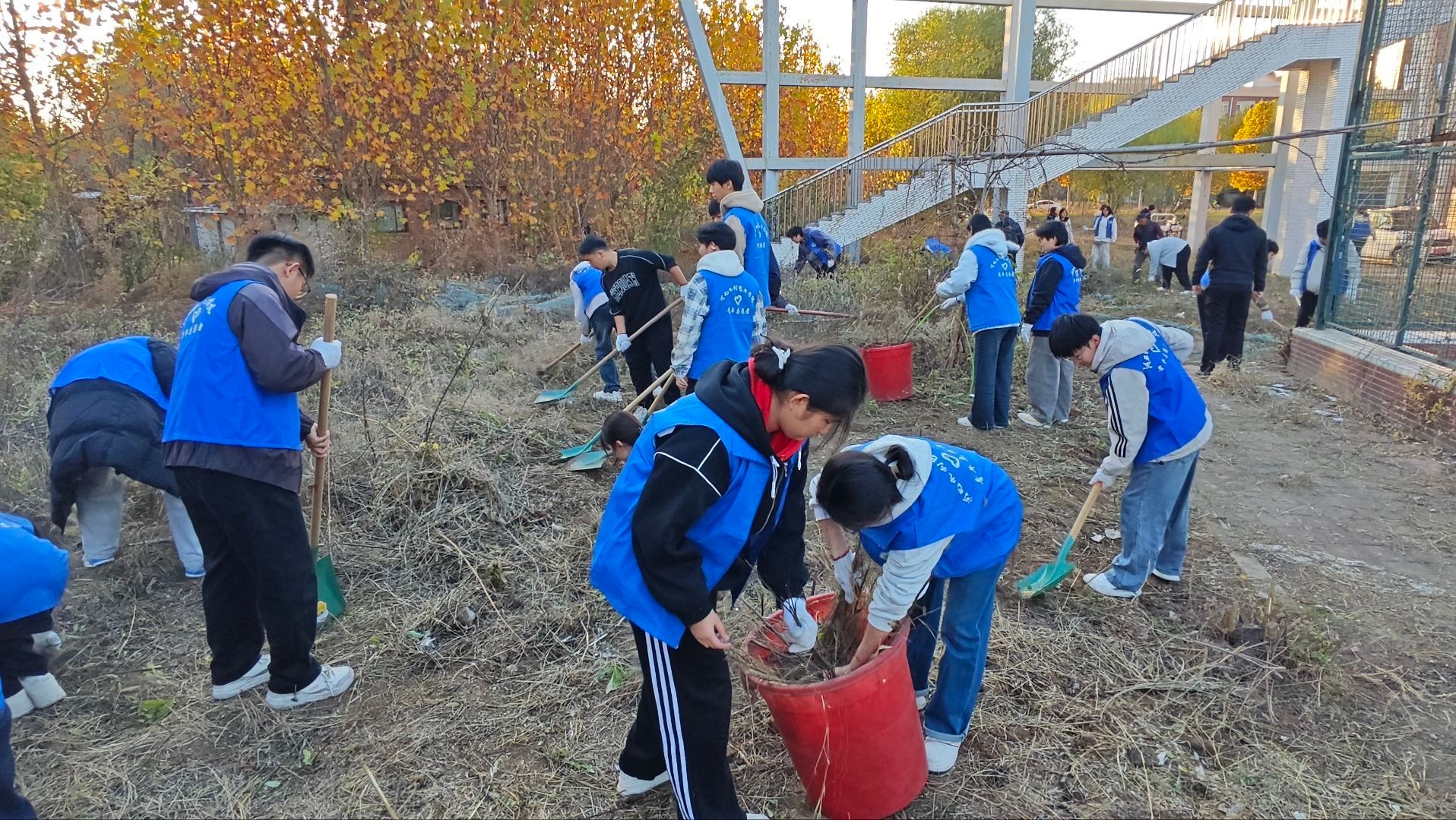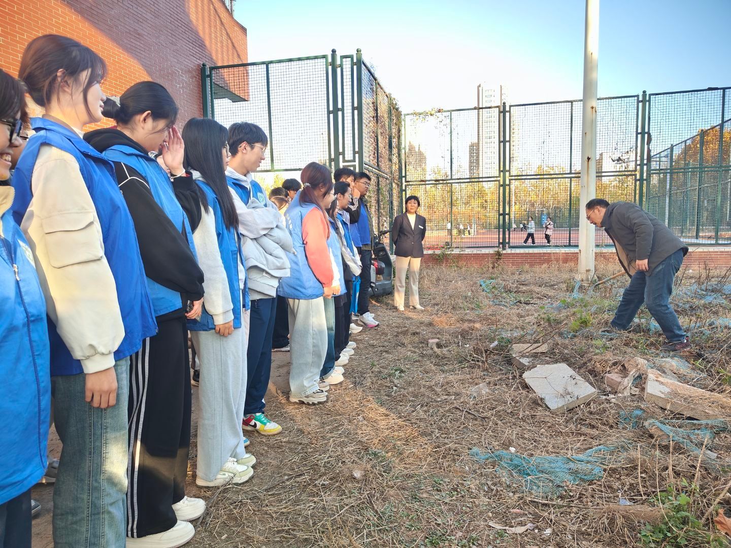 接着同学们齐心协力,在保证自身安全的前提下,男生们拿着铁锹和镰刀清理荒地,女生们清理垃圾与杂草。