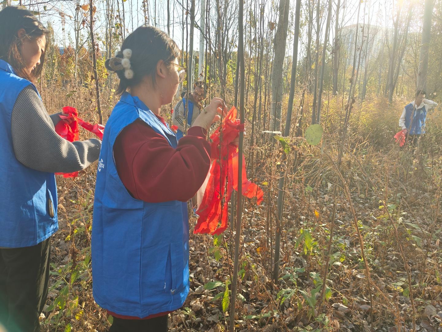 活动过程中,先由40志愿者寻找适合移植的小树并给的小树系上红色的丝带做好标记。