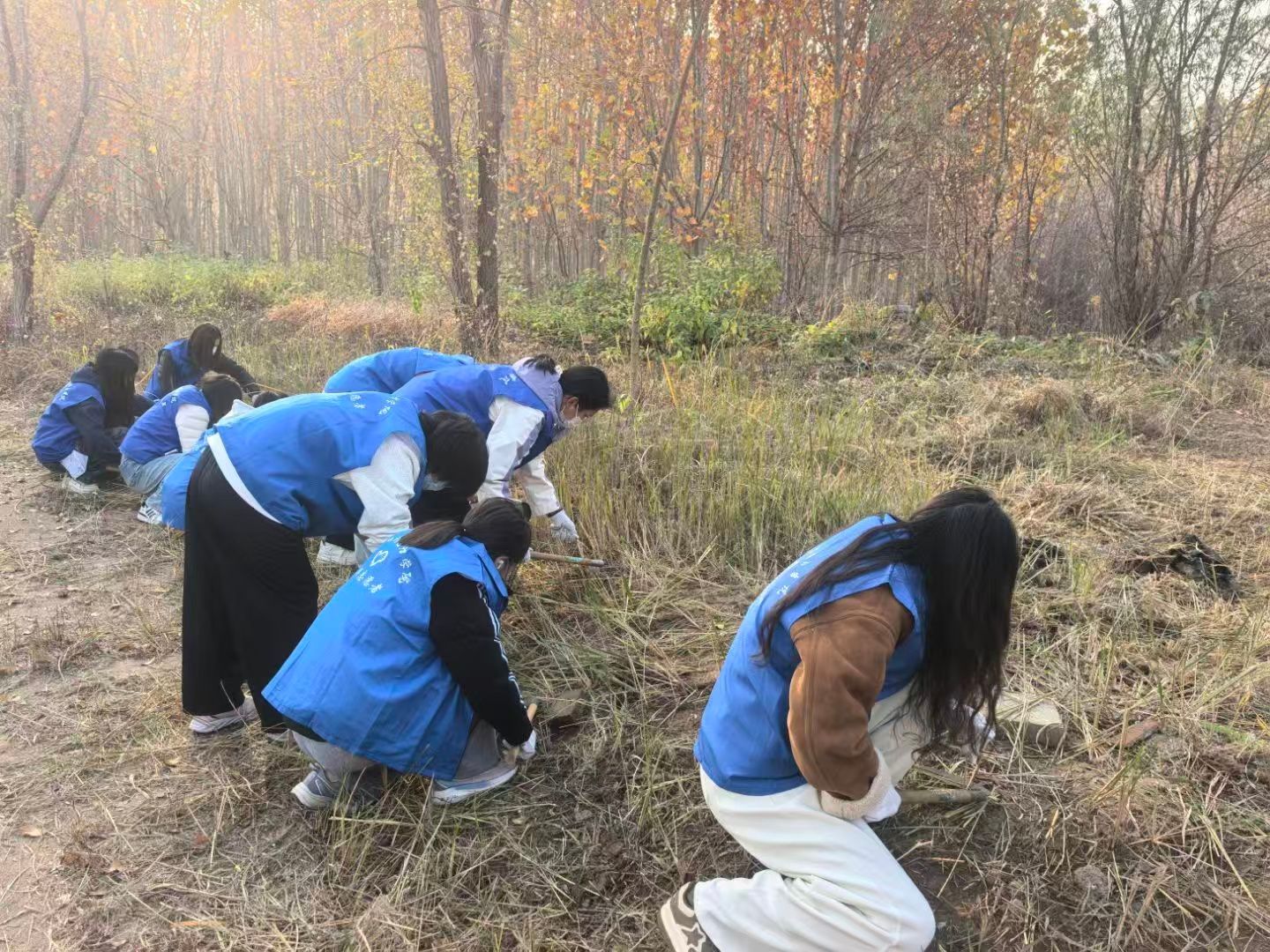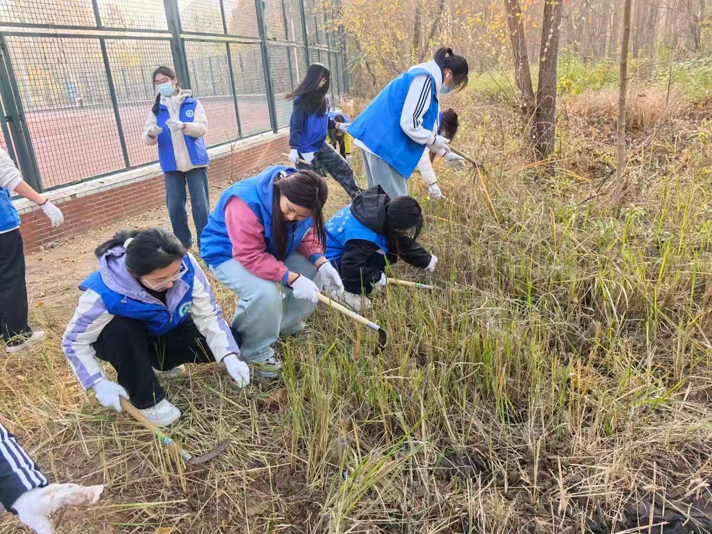 第三期聚焦剩余荒地的开垦收尾,志愿者灵活调整,配合高效:女生参与镰刀割草、垃圾规整工作,男生配合铁锹翻整土地,共同完成场地优化,为后续苗木依植做好准备。