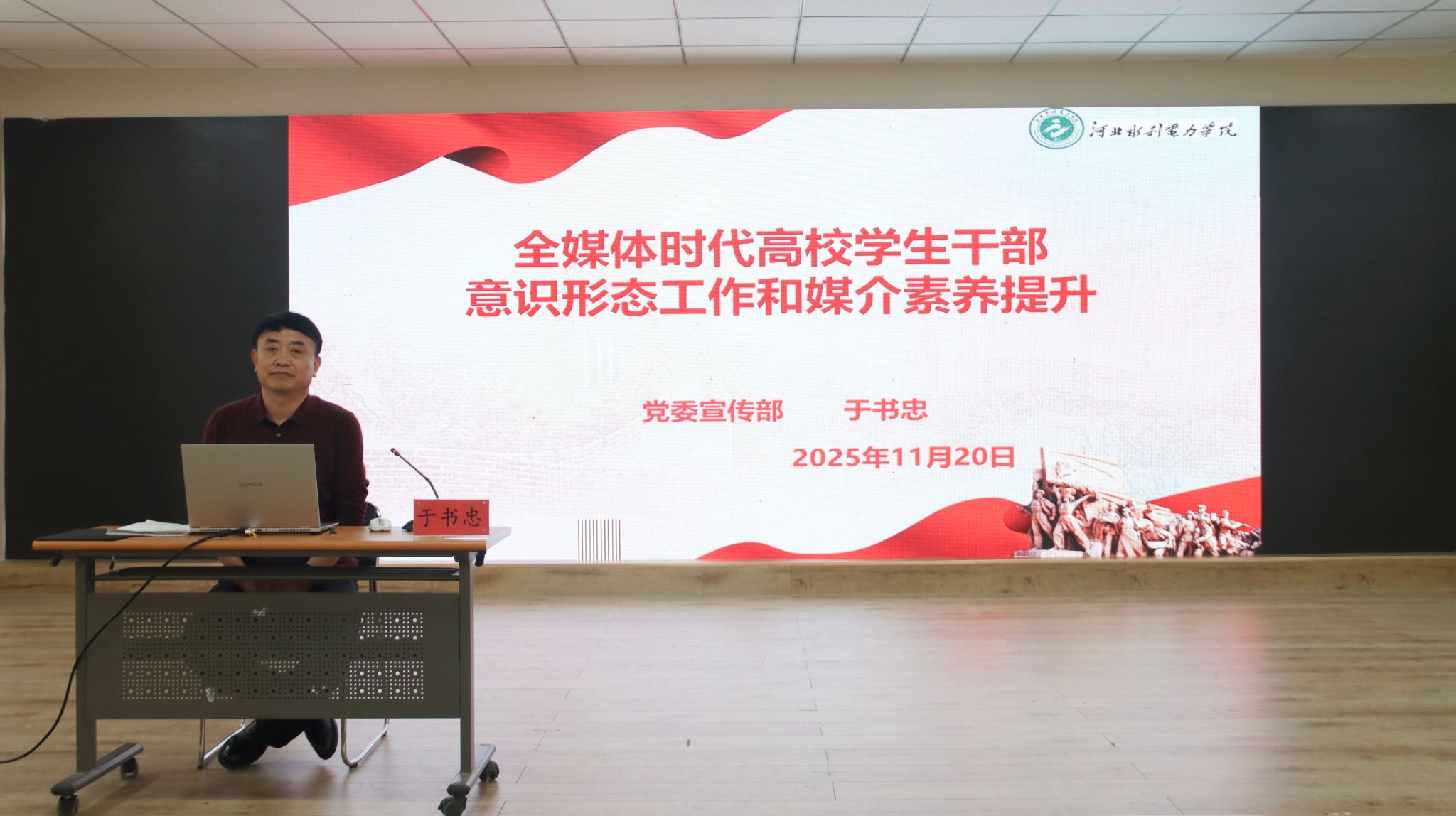 11月20日下午4:00,2025年“青马工程”大学生骨干秋季培训班第四讲在启智楼B402举办。培训第四讲主题为《全媒体时代高校学生干部意识形态工作和媒介素养提升》,本次培训由学校党委宣传部部长于书忠主讲,校团委书记庞进主持,各校级组织相关负责人、各社团团支部书记参加了本次培训。