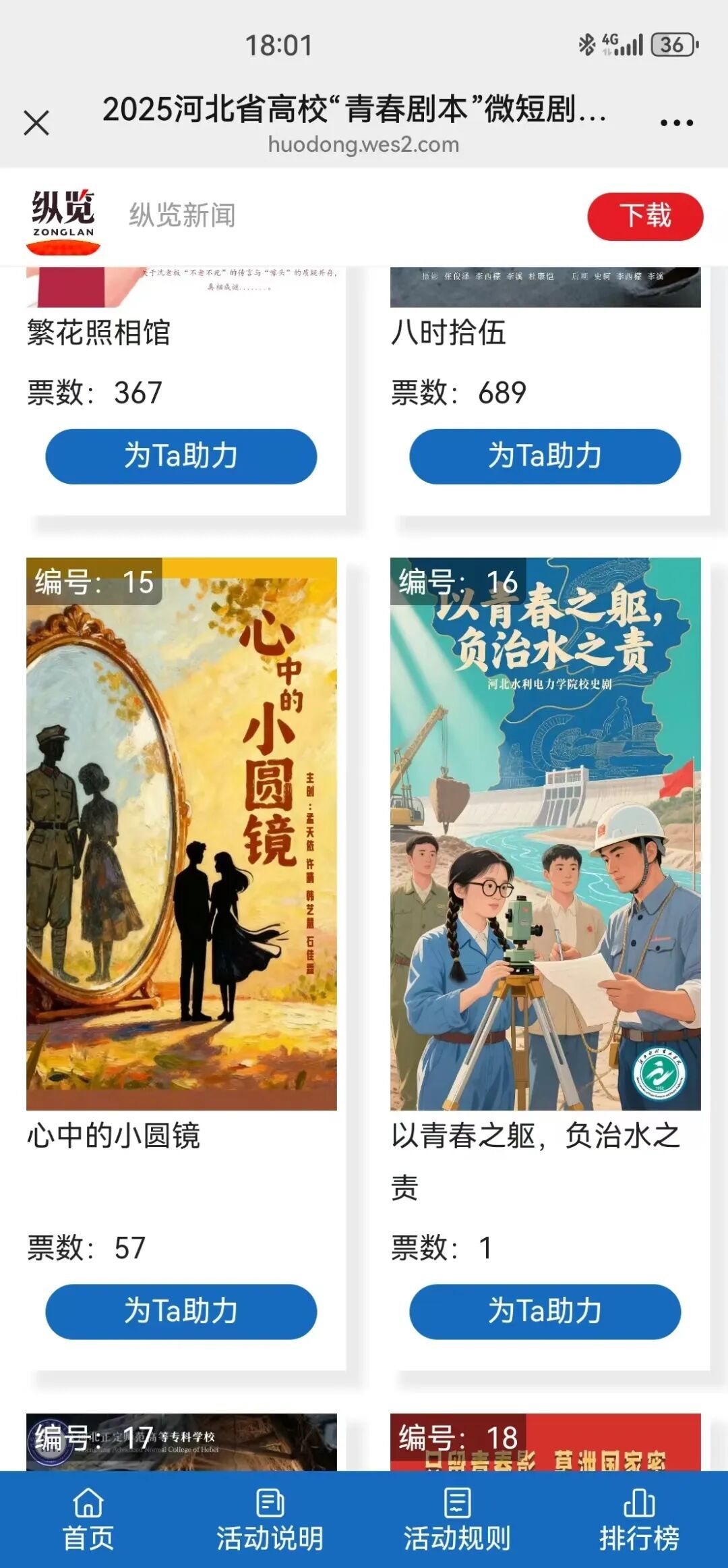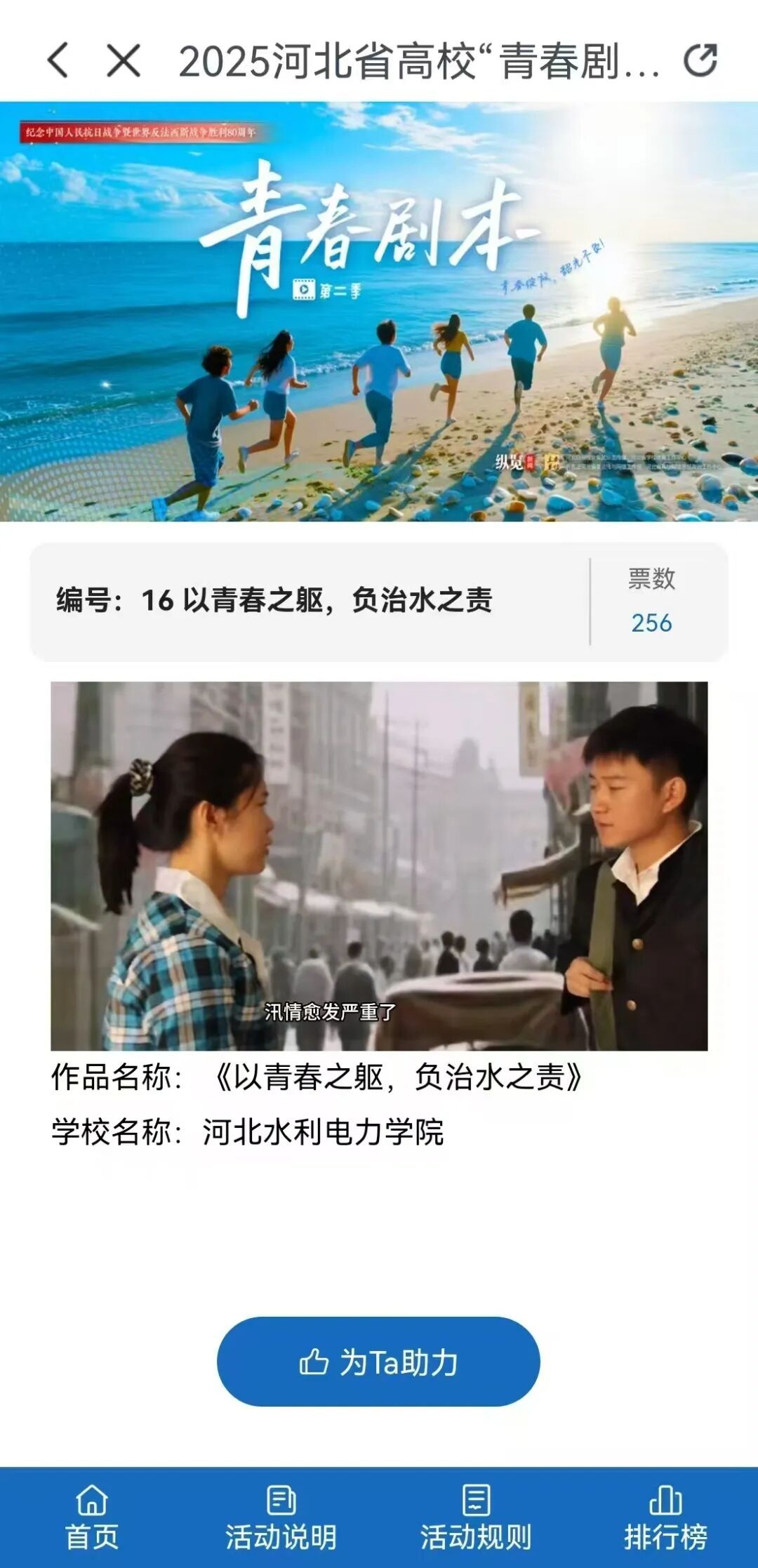 河北省高校“青春剧本”微短剧展演大赛(第二季)网络展演今日正式启动,现邀请水院学子为编号16号作品《以青春之躯,负治水之责》进行投票。该短剧为我校艺术团拍摄的校史短剧。根据要求,投票时间为11月25日——12月13日15时,每人每天最多可助力五次。