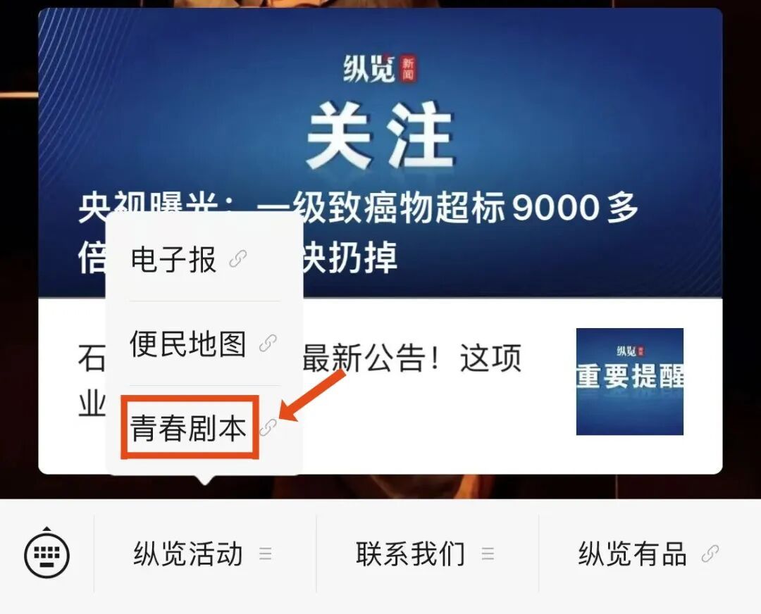 关注“纵览新闻”微信公众号,点击底部菜单“纵览活动”进入“青春剧本”投票页面进行投票。