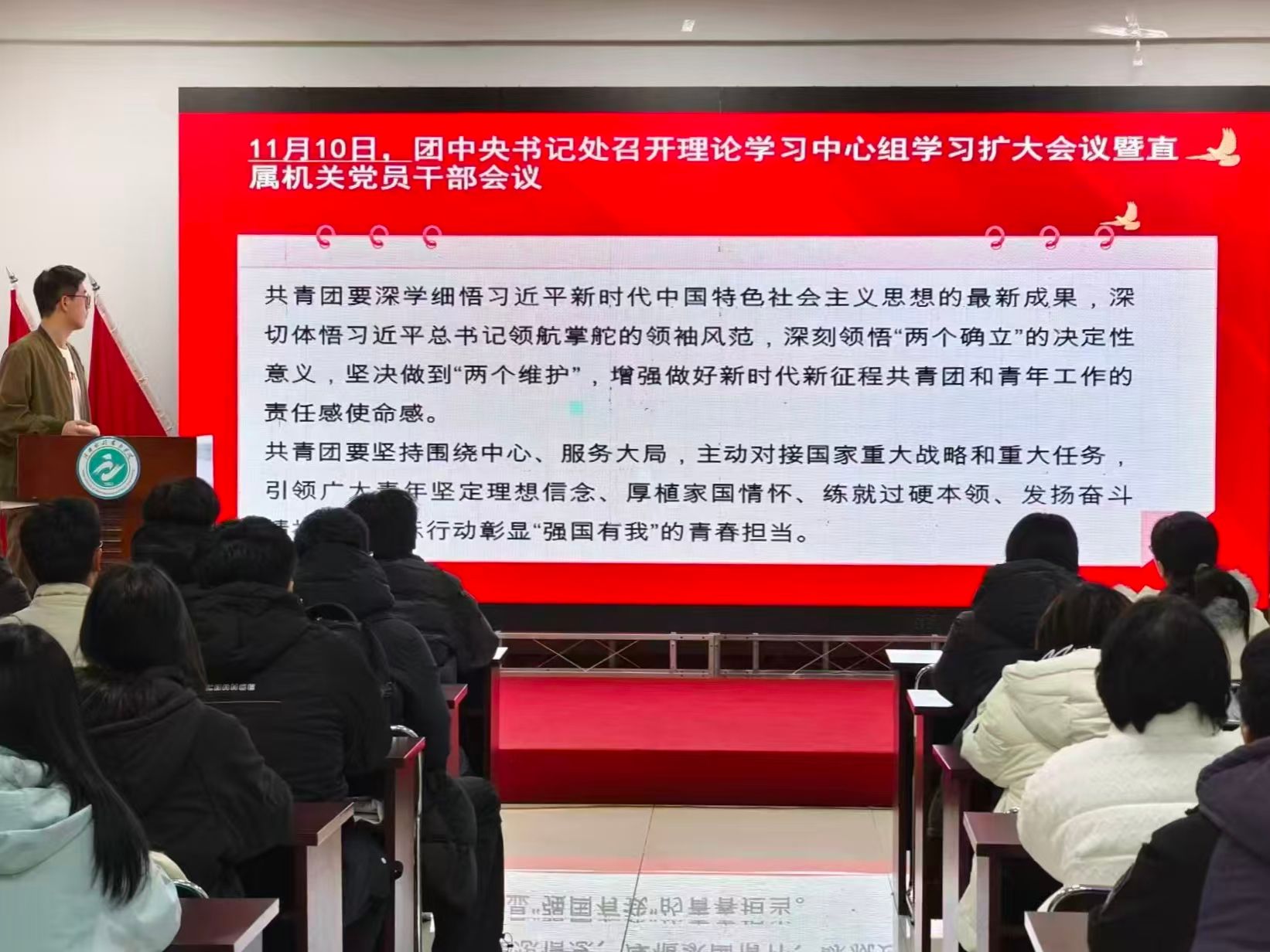 张瑞鹤围绕全会关于推进国家治理体系和治理能力现代化的重要论述,结合“十五五”规划目标,系统解读了“十五五”时期承前启后的战略地位,强调了新时代青年在服务社会、参与治理中的责任与使命。他阐释了“奉献、友爱、互助、进步”的志愿者精神与全会“人民至上”理念的内在契合性——从“奉献”“友爱”与“人民至上”的价值同源,到“互助”“进步”对“十五五”时期社会建设的实践支撑,让在场的青年团员清晰的认识到,践行志愿者精神正是青春力量服务“十五五”发展大局的生动路径。