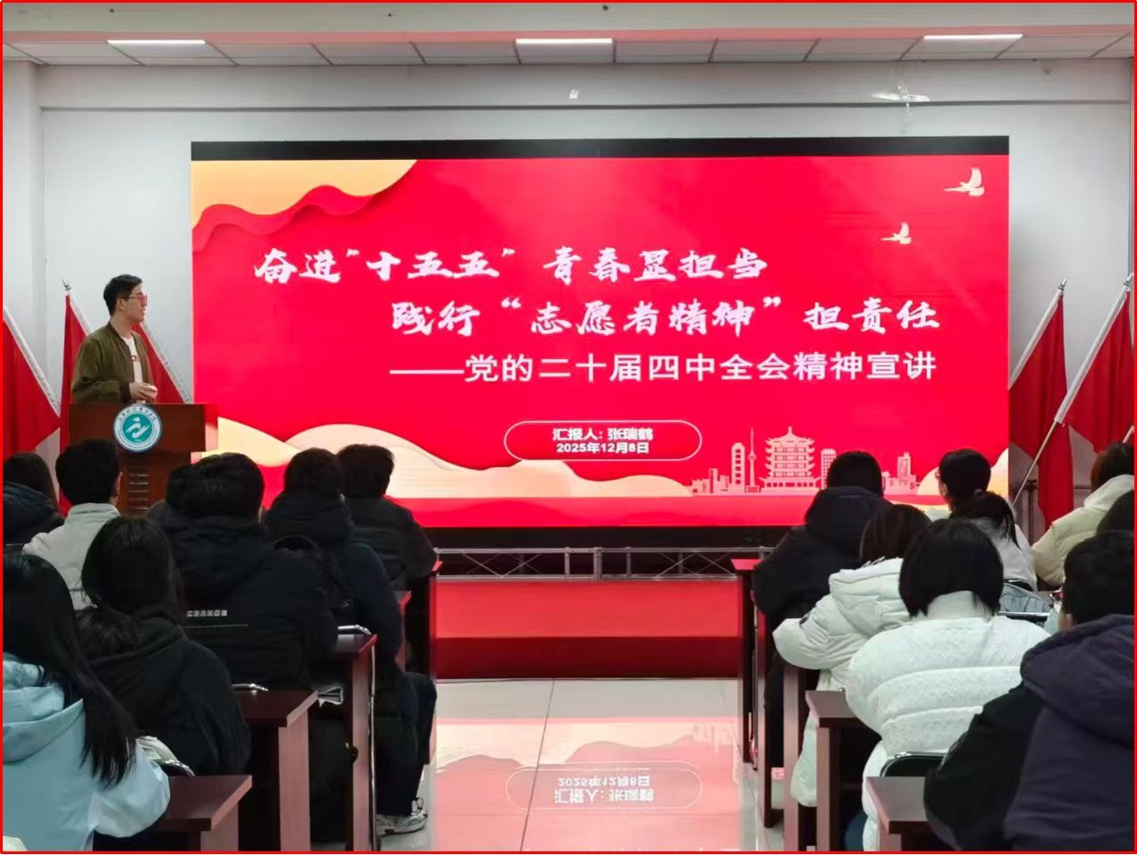 为深入学习贯彻党的二十届四中全会精神,切实把思想和行动统一到党中央决策部署上来,引导青年志愿者在新征程中践行使命担当,大学生志愿者联合会功能型团支部于2025年12月8日,组织开展了“奋进‘十五五’青春显担当,践行‘志愿者精神’担责任”主题团日活动,团支部书记张瑞鹤主持并领学,全体团员青年参加。