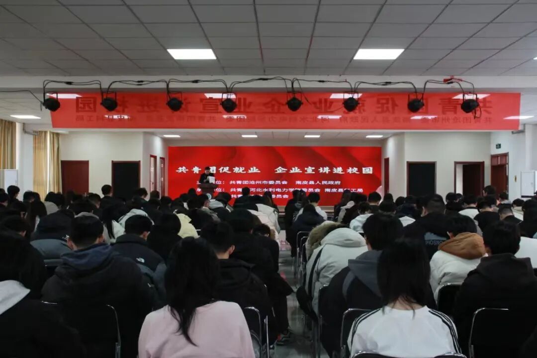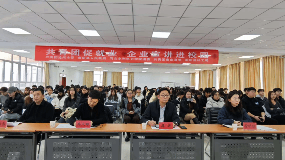 青春逐梦正当时,就业护航暖人心。12月18日下午,由共青团沧州市委指导、校团委主办的“共青团促就业,企业进校宣讲”活动在启智楼b402顺利举行。共青团沧州市委副书记禹天雄、河北水利电力学院团委书记庞进、南皮县科工局局长于振勇、共青团南皮县委书记徐明佳等领导出席了此次活动。各系负责人、企业代表及在校学生共计200余人参加了本次活动。