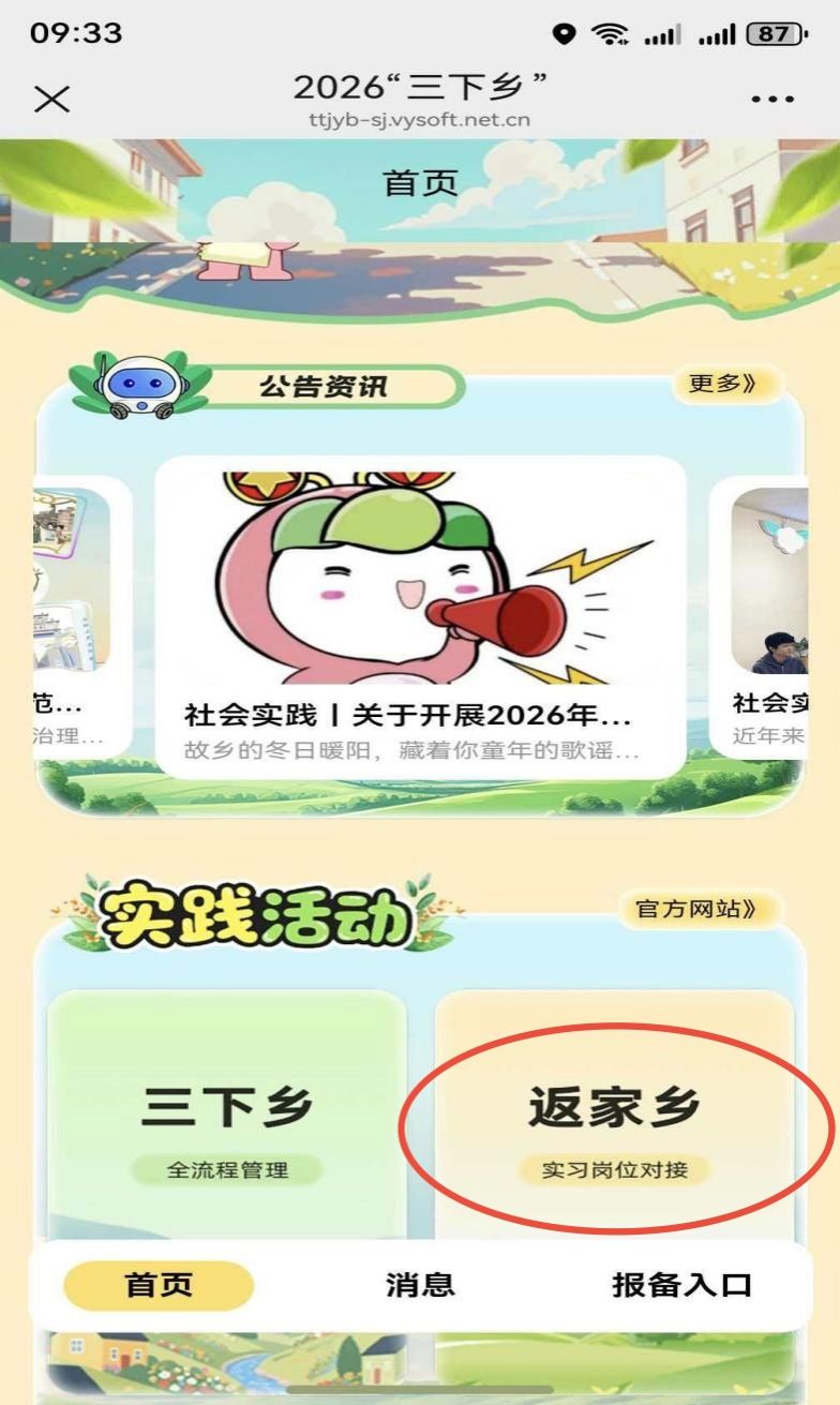 3.进入2026“三下乡”专题页面后,点击“返家乡”(实习岗位对接)板块,进入报名主界面。