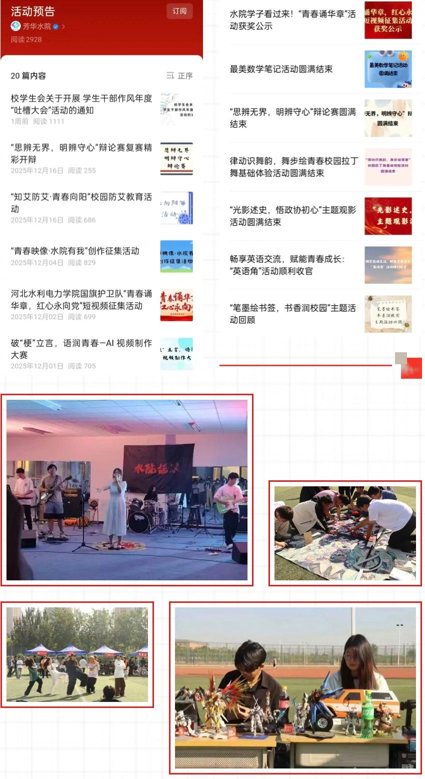 社团活力:全程跟进社团活动,从预告到赛事风采展播,全方位展现校园文化活力。