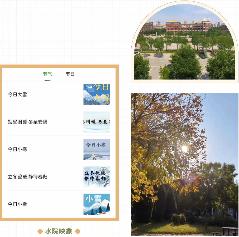 时节有情:跟着二十四节气逛校园,实时播报四季景致变化,发布温馨时节提示,定格水院专属美好。