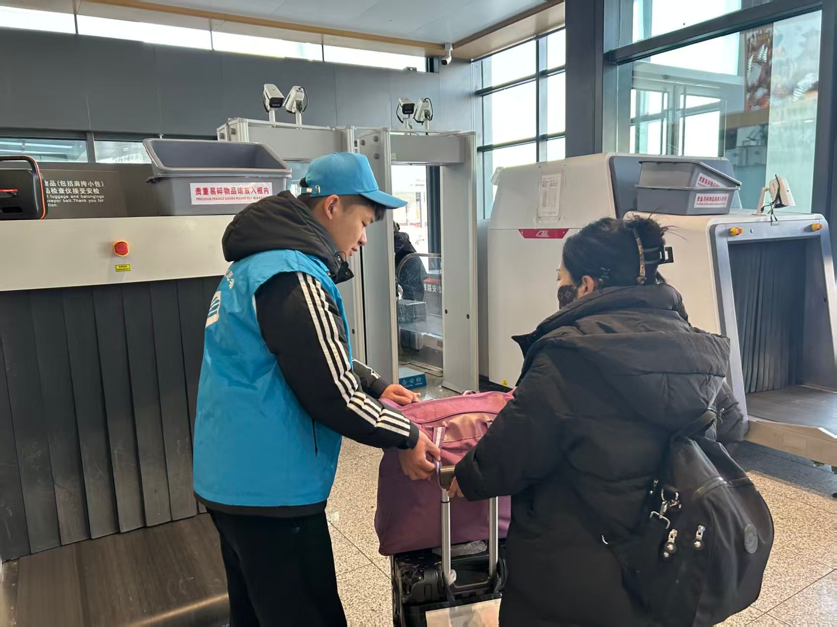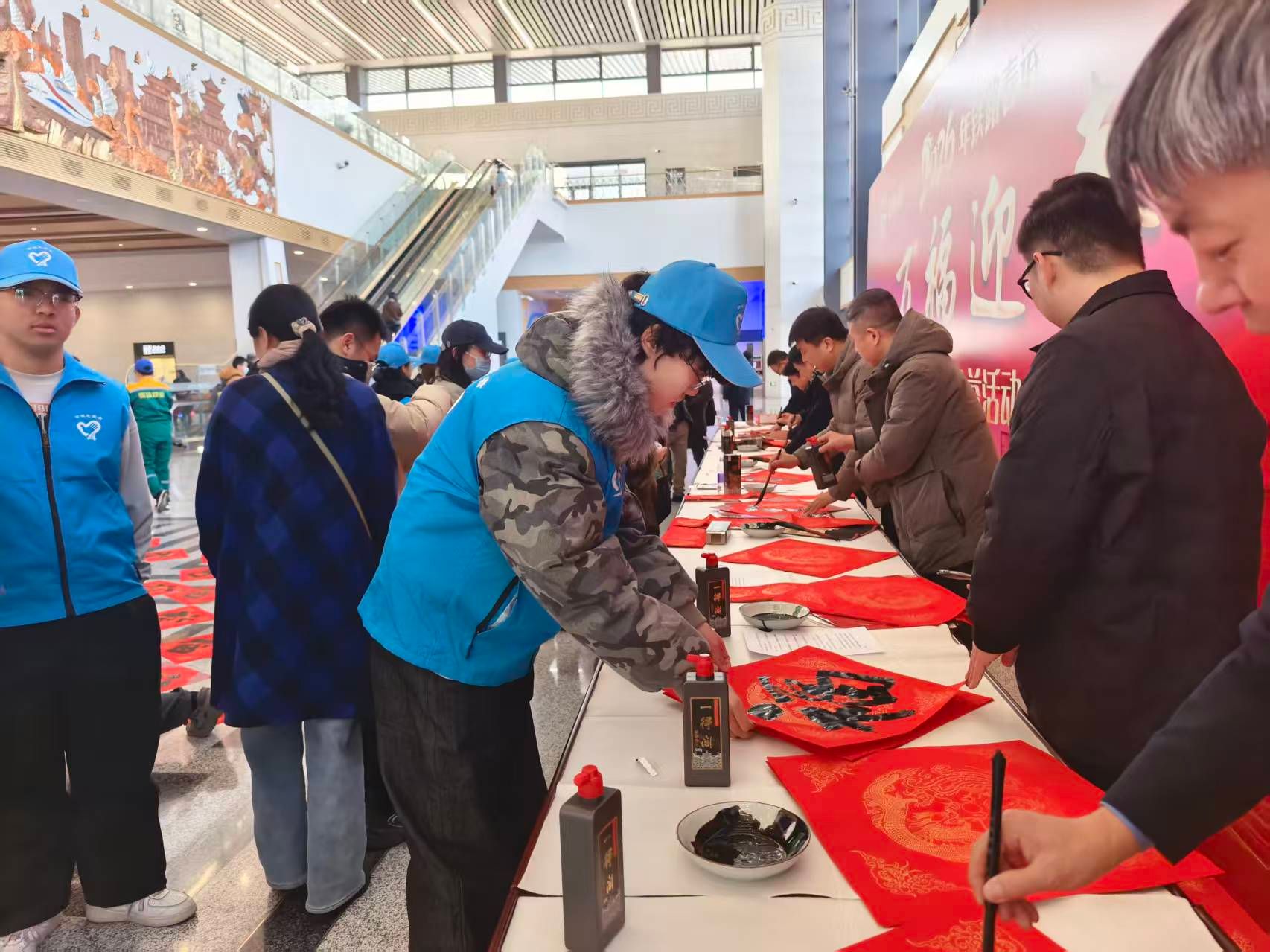活动当天清晨,志愿者们准时在沧州站集结。经过简短的岗前培训后,大家迅速投入服务工作。现场分工明确、配合默契:有的志愿者为过往旅客递上精心准备的春联与福字,让红火的笔墨承载着浓浓的年味与真挚祝福;有的主动维持现场秩序,保障活动有序开展;还有的耐心解答旅客的出行咨询,用细致服务为旅途保驾护航。一句句真诚问候传递着温暖善意,志愿者们热情周到的表现,赢得了车站工作人员与广大旅客的一致赞誉,成为春运路上一道亮眼的风景线。