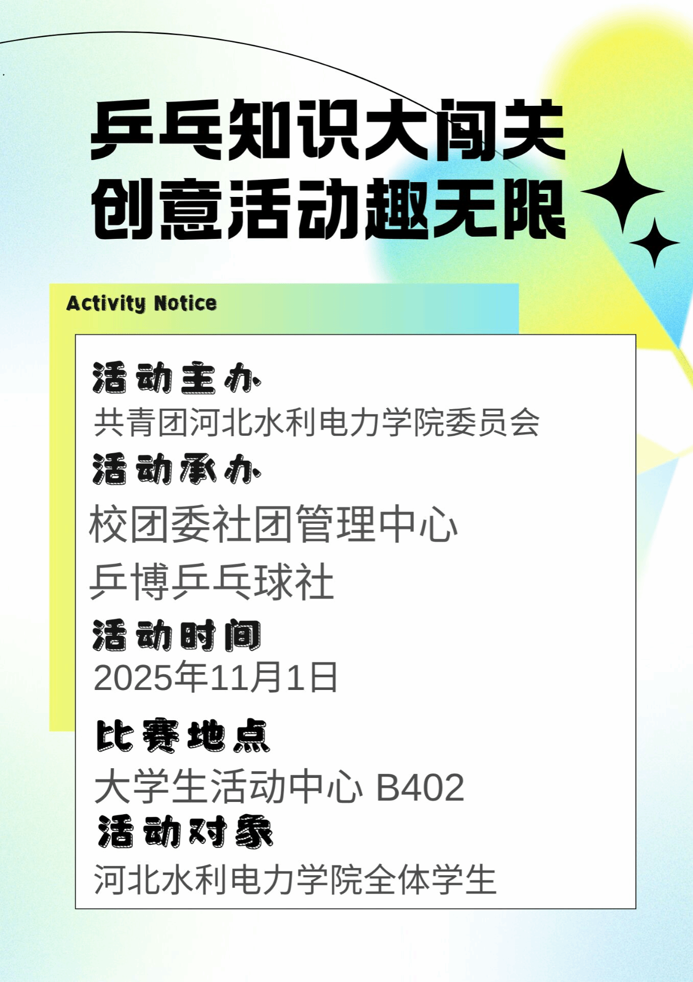 本次活动旨在丰富学生的校园生活,推动乒乓球文化在校内的传播。通过乒乓知识竞答,帮助学生系统了解乒乓球运动规则、历史等知识,提升对这项运动的认知与兴趣;借助 DIY 创意手工环节,鼓励学生利用基础材料发挥想象,锻炼动手能力与创新思维。同时,以组队形式开展活动,增强学生团队协作意识,进一步激发学生参与的热情,营造积极健康、兼具知识性与趣味性的校园氛围。
