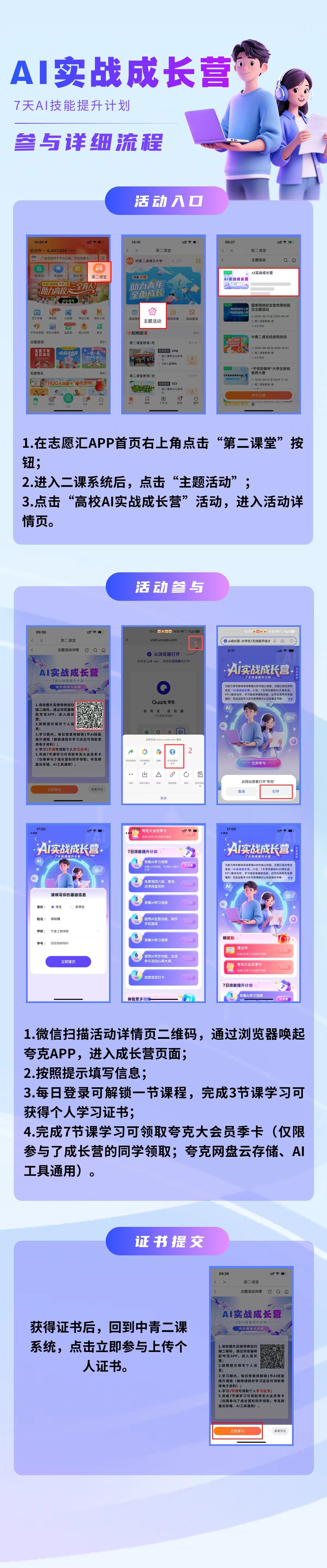 按照提示完成信息填写→进入活动后每日解锁课程,并合理安排时间完成课程学习→学习3节课后,可领取学习证书→回到中青二课,上传学习证书→学习7节课后,可领取夸克大会员季卡