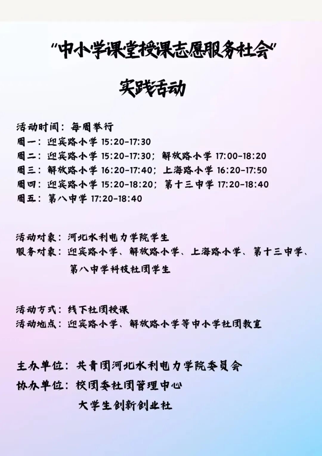 本活动设有培训流程,培训通过且时间允许的同学可参与中小学志愿服务活动,最终解释权归活动主办方所有。