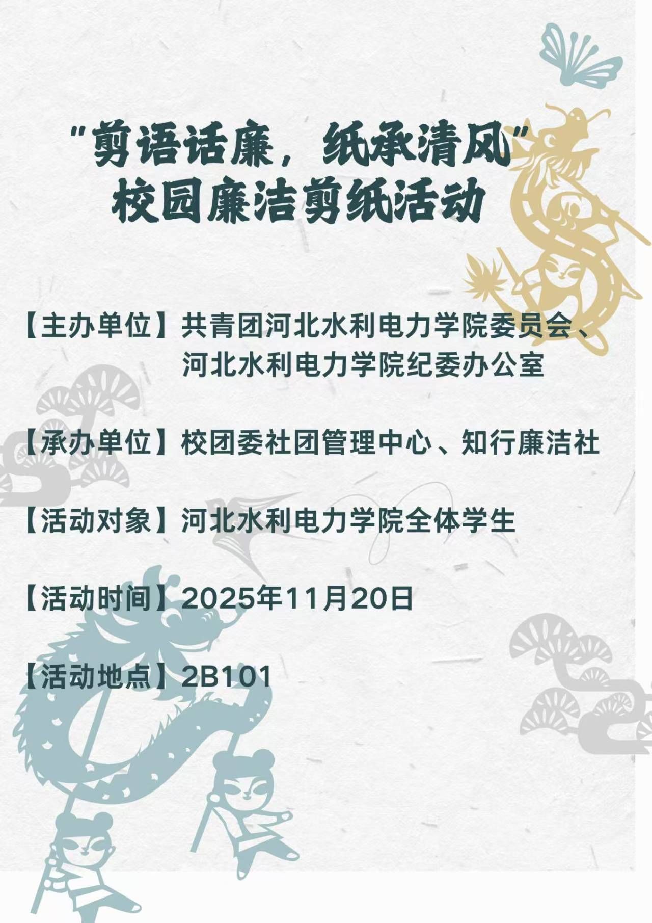 为帮助青年学子直观理解廉洁文化的精神内核,以传统剪纸工艺为创新媒介,借剪纸“精剪细裁、坚守章法”的特性隐喻“廉洁自律、不越底线”的行为准则,引导学生树立正确的价值观与行为边界,丰富校园文化活动形式,营造“人人思廉、处处见廉”的校园文化氛围。