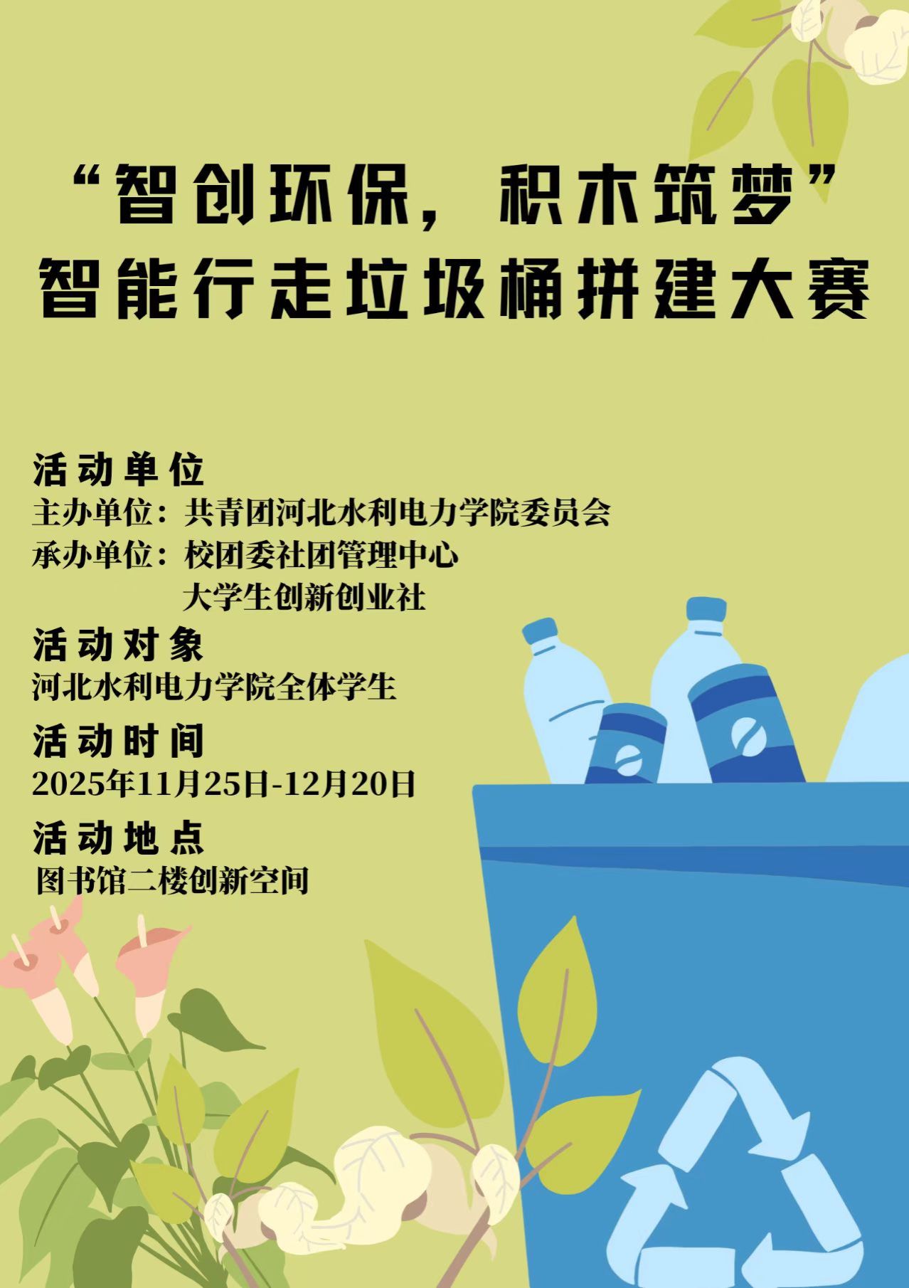 以“智能行走垃圾桶”拼建为核心,融合积木搭建、AI编程与环保需求,激发大学生创新实践热情,培养跨学科解决问题的能力,普及实用科技技能,传递环保理念、营造绿色校园氛围,搭建创新创业展示平台,丰富校园科技文化生活。