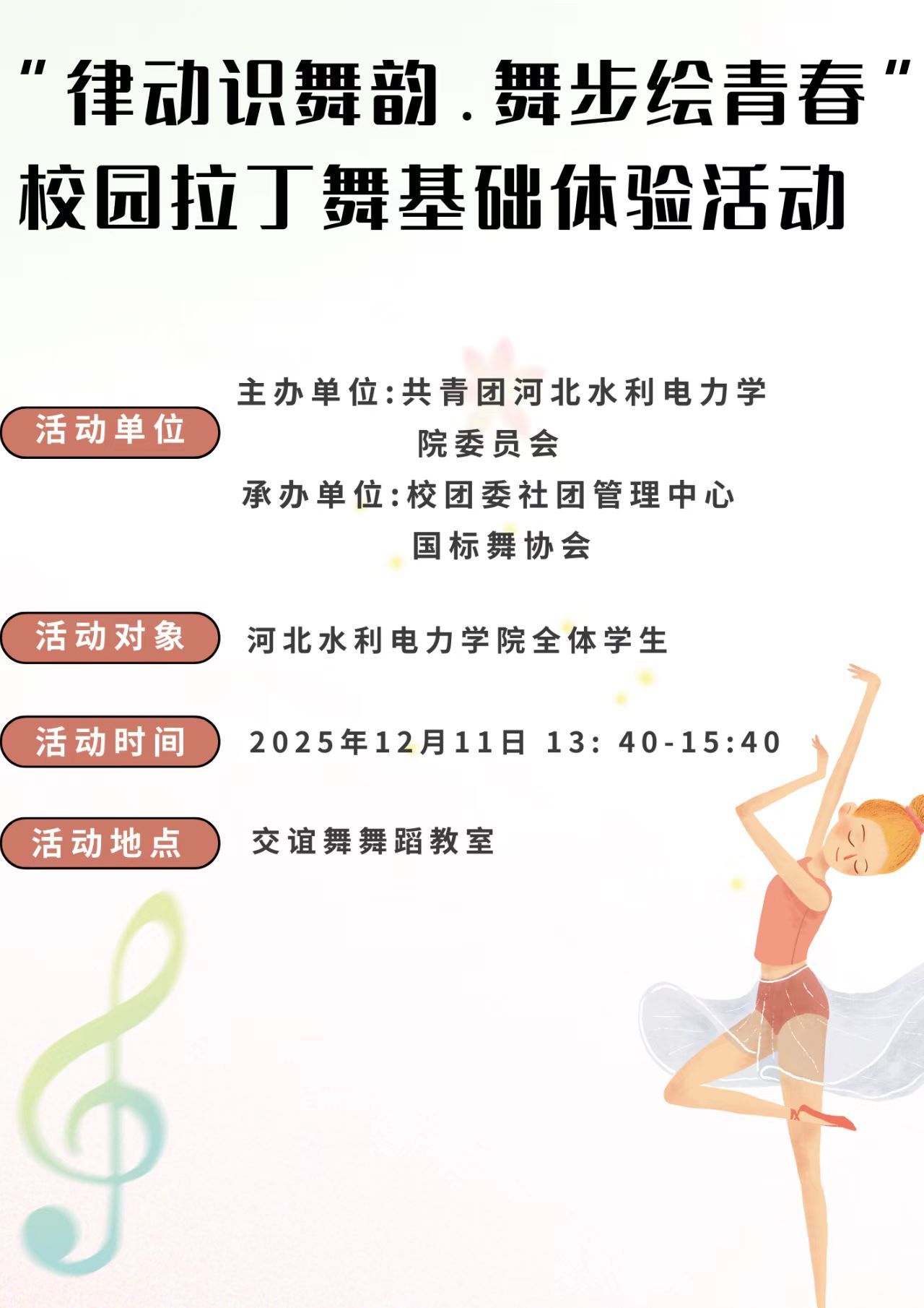 以舞蹈为载体,丰富校园文化表达形式,构建多元包容的文化氛围。通过系统引导同学们认知拉丁舞的核心节奏特征,精准掌握区分不同舞种的节拍规律、速度差异及风格精髓,在肢体律动中培育敏锐的节奏感知力与精准的身体控制力。期待活动参与者在自信展示舞姿的过程中释放压力,强化自我认同;在集体的互动中增进协作意识,从而实现“以美育人、以文化人”的目标,为校园文化注入艺术活力。