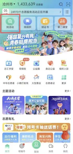 2.在“找活动”页面找到想报名参加的志愿服务活动。