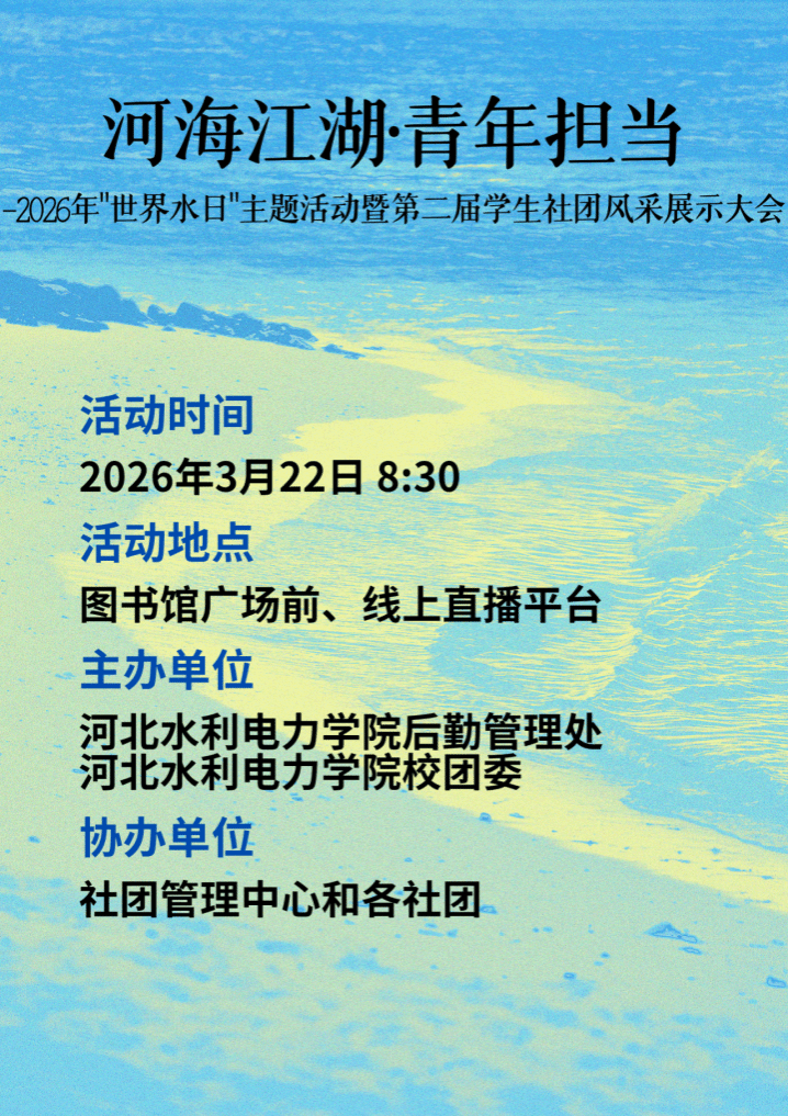 为深入贯彻落实“节水优先、空间均衡、系统治理、两手发力”的治水思路,弘扬新时代水文化,增强水院学子对水文化的认同感与自豪感,在第三十四届“世界水日”和第第三十九届“中国水周”即将来临之际,校团委联合后勤管理中心组织开展“河海江湖·青年担当”2026年"世界水日"主题活动暨第二届学生社团风采展示大会。