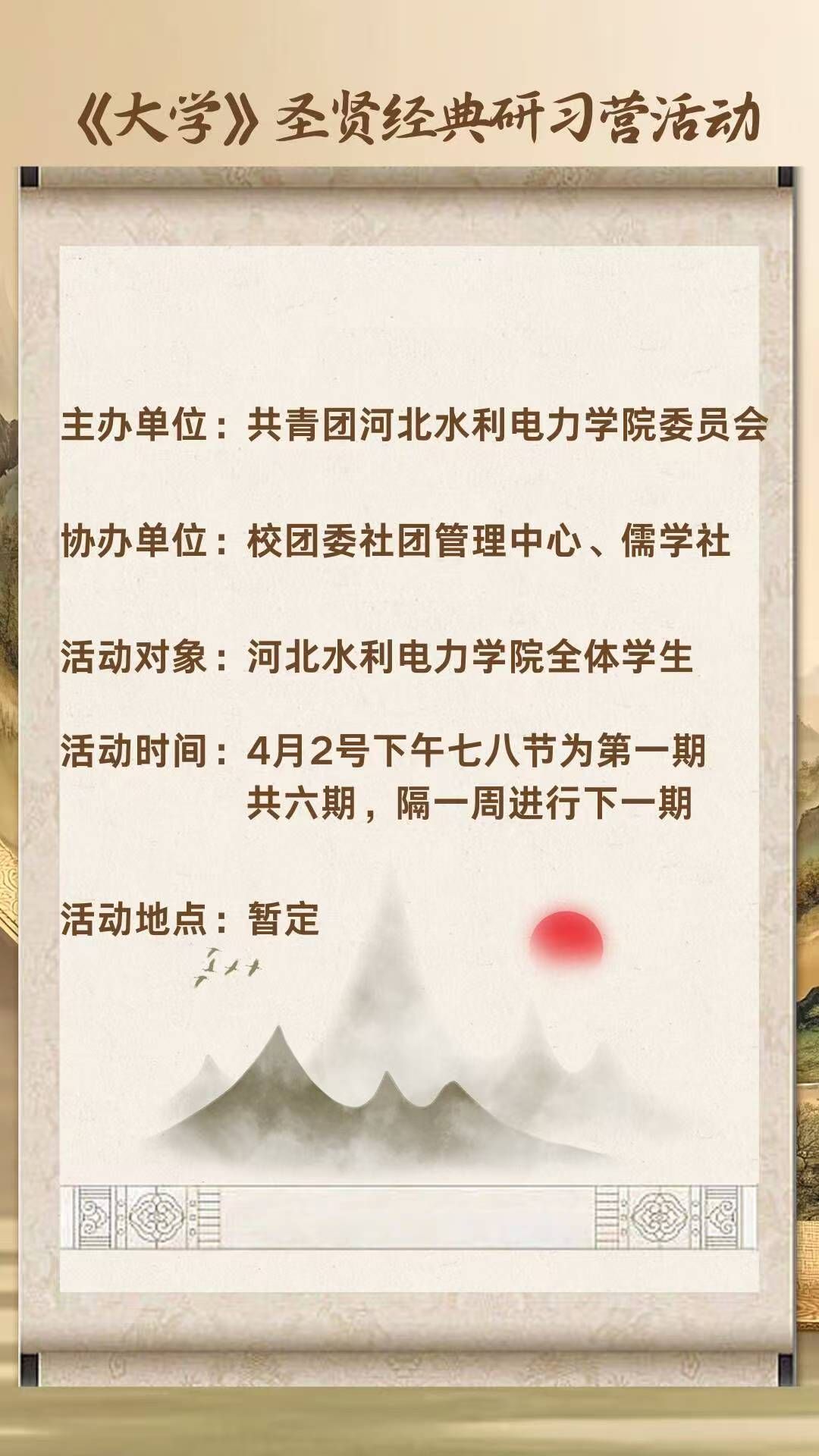 由共青团河北水利电力学院委员会主办,校团委和儒学社协办的《大学》圣贤经典研习营实践活动,立足《大学》中华优秀传统文化核心内涵,旨在深化大学生传统经典认知与文化感悟,提升经典研读思辨、文化理解与交流表达能力;同时搭建校园共读共学交流平台,深耕文化育人阵地,筑牢校园文脉传承与思想培育根基。