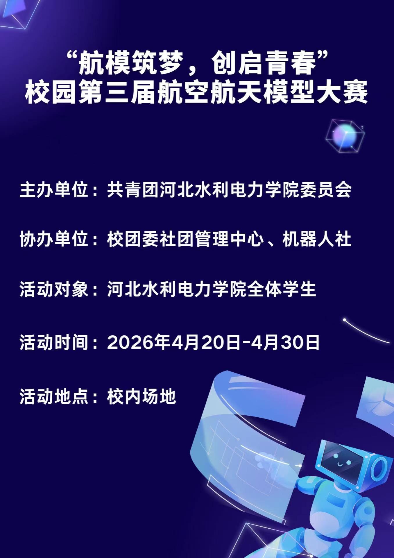 由校团委办,社团管理中心及其机器人社协办的校园第三届航空航天模型大赛活动,立足科技强国与航天事业的发展背景,旨在破解学生航空航天知识认知不直观、理论难以转化为实践的难题,提升学生动手操作、创新思维与科学探究能力;同时搭建校园科技实践与创新交流平台,筑牢学生科学素养培育与校园科技文化建设根基。